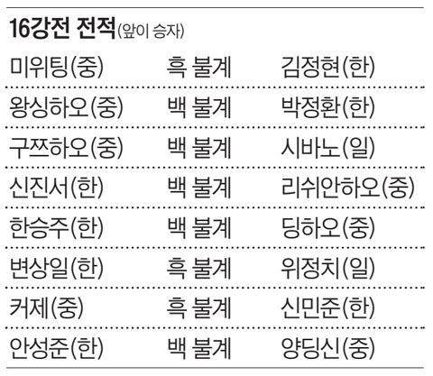 LG배 본선에 처음 오른 한국 12위 한승주(27)는 디펜딩 챔프 딩하오(23)를 백 불계로 제쳐 기염을 토했다. 전기 챔프는 이듬해 조기 탈락한다는 LG배 징크스가 올해도 계속됐다. 이 밖에 안성준(32)과 변상일(26)도 양딩신과 위정치를 누르고 8강에 상륙했다.