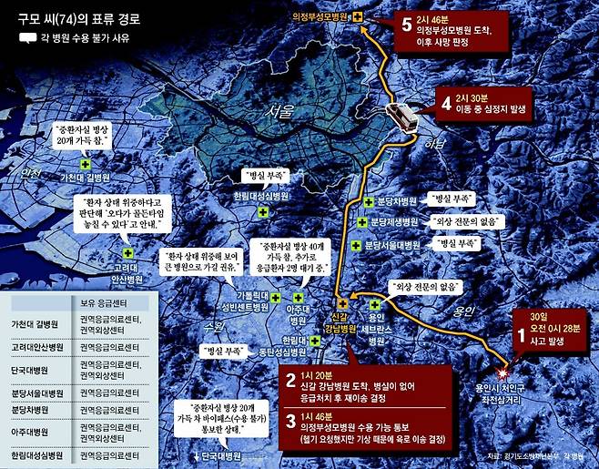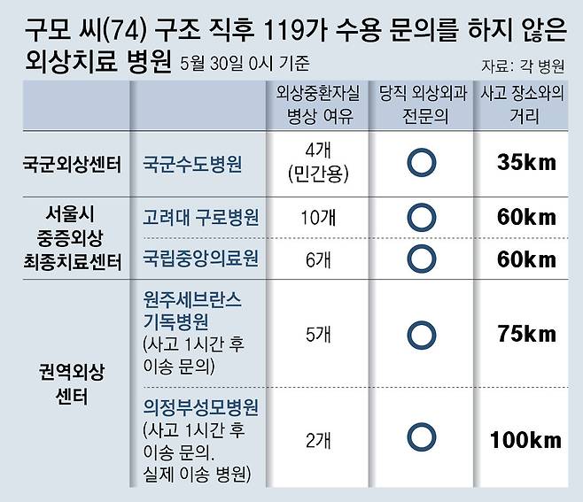 31일 동아일보 취재를 종합하면 119구급대는 전날 0시 38분 경기 용인시에서 사고를 당한 구모 씨(74)를 구조했다. 당시 35km 떨어진 국군수도병원 국군외상센터에선 외상외과 전문의 2명이 당직을 서고 있었고, ‘민간용’ 중환자실 병상도 4개 비어 있었다. 같은 시간 서울시가 ‘중증외상 최종치료센터’로 지정한 고려대 구로병원과 국립중앙의료원에도 중증외상 환자를 수술할 의료진과 병상이 있었다. 이 병원들은 사고 현장에서 약 60km 떨어져 있다.