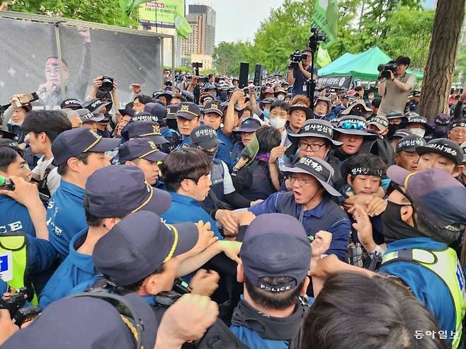 경찰은 이들을 포위한 채 “지방자치단체가 허용하지 않은 불법 시설물”이라는 경고방송을 하고 저지에 나섰다. 또 분향소를 설치하던 곳으로 진입을 시도했다. 진입을 막으려는 민노총과 경찰 사이에서 고성이 오갔고 몸싸움이 발생했다.
