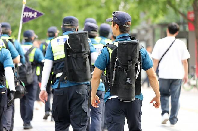 | 캡사이신 장비 멘 경찰들 31일 오후 서울 중구 세종대로 일대에서 열린 전국민주노동조합총연맹(민노총) 집회 현장에서 경찰이 불법 집회에 대비해 캡사이신(고추 추출물) 분사 장비를 멘 채 이동하고 있다. 뉴시스 |