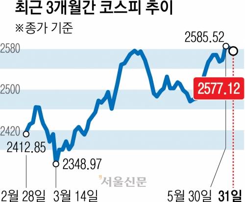 31일 코스피는 전 거래일 대비 8.40포인트(0.32%) 내린 2577.12에 거래를 마쳤다. 이날 북한의 우주발사체 발사로 증시 변동성이 우려됐으나, 전 거래일 대비 0.51포인트 오른 2586.03으로 출발하며 하루 전 기록한 연고점(2585.52·종가 기준)을 넘어섰다. 이어 2590대에 진입, 오전 9시 16분 2596.31까지 올라 지난해 6월 10일(2602.80) 이후 장중 최고가를 기록했다.