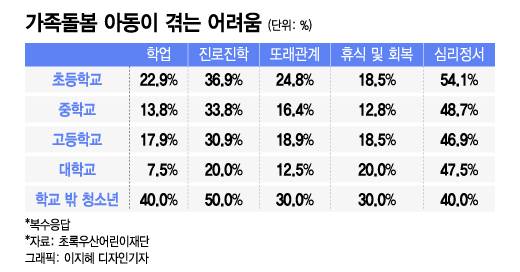 초록우산어린이재단이 지난해 최근 1년 이내 재단으로부터 경제적 지원을 받은 이들 중 만 7~24세 아동·청소년을 대상으로 조사한 결과 응답자 중 46%가 영 케어러였으며, 그중 23%가 초등학생인 것으로 나타났다. 절반 이상(59%)은 한부모 세대였으며, 학습 및 진로진학, 경제활동과 더불어 돌봄 역할의 부담이라는 이중고를 겪고 있었다. 나이가 어릴수록 심리·정서적 어려움을 호소하는 것으로도 조사됐다.