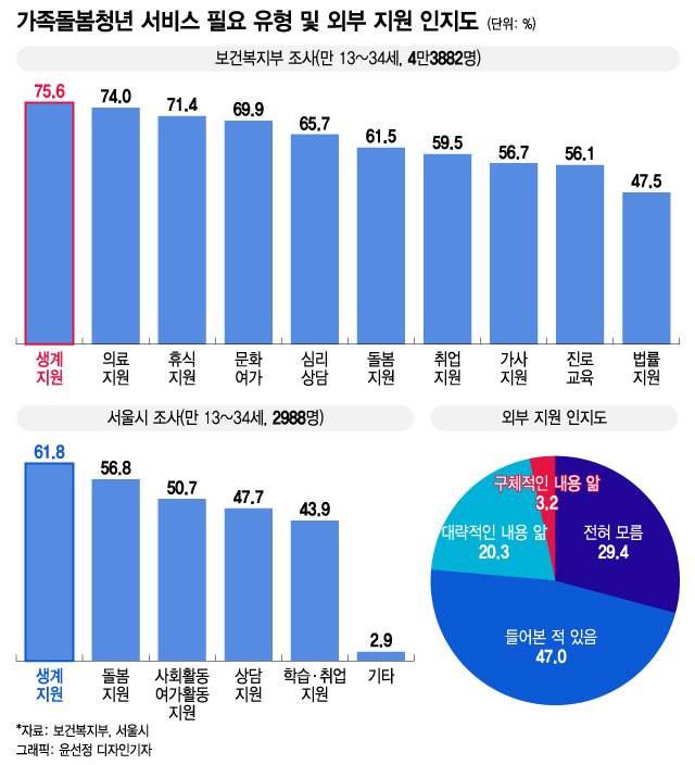 실제 지난 4월 복지부와 서울시가 발표한 조사에서 모두 영 케어러들은 '생계지원'이 가장 절실하다고 응답했다. 수치로는 각각 75.6%, 61.8%였다. 이어 2위는 복지부 조사에선 의료, 서울시는 돌봄 지원이었다. 선호하는 순위는 조금씩 달랐을지 몰라도 영 케어러 모두 최소 2개 이상의 지원을 바라고 있었다. 7년째 영 케어러 생활 중인 김현주씨(26)는 "한 부분이 해결된다고 돌봄을 벗어날 수 있진 않다"며 "경제적 문제를 해결해도 시간이 없을 수 있고, 정보가 부족해 지원액을 어떻게 사용해야 할지 모르는 경우도 있을 것"이라고 지적했다.