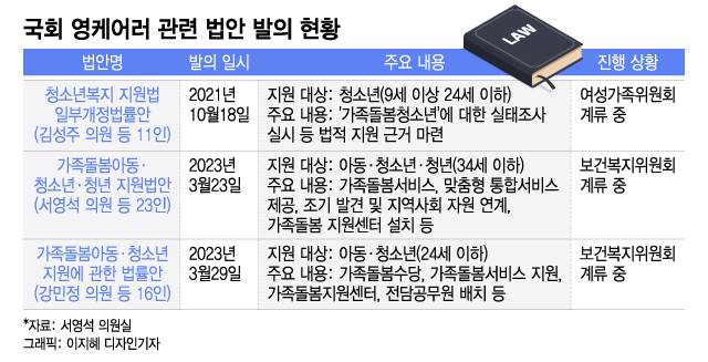 현재 국회에도 영 케어러 지원 및 관련 기구 설치 등의 근거가 담긴 법안 3건이 발의된 상태지만, 모두 계류 중이다. 지난 3월 '가족돌봄아동·청소년·청년 지원법'을 대표 발의한 서영석 더불어민주당 의원은 "사건이 공론화됐을 당시 대선 후보들도 국가의 간병 지원을 강화하겠다는 공약을 내걸었지만, 아직도 전국에 정확히 몇 명의 영 케어러가 존재하는지 규모 파악조차 안 되는 등 유의미한 변화는 없었다"고 진단했다. 그러면서 "국회에서라도 하루빨리 이들에 대한 종합적인 체계적인 지원체계를 마련하도록 하는 법안이 통과돼야 한다"고 촉구했다.