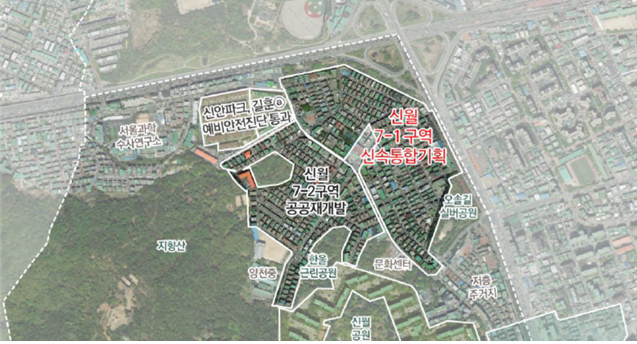 서울시는 신월7동 931일대의 신속통합기획안을 확정했다고 1일 밝혔다. 대상지는 주변에 지양산, 곰달래공원, 오솔길공원, 독서공원 등 녹지가 산재해 있으나 노후·방치되고 상호 연결성 부족으로 활용도가 떨어져 있었다. 이에 시는 기존 공원과 연계한 공원 신설과 함께 대상지 주변 흩어진 녹지를 입체적으로 연결해서 도심 속 풍부한 정원·녹지를 어디서든 만날 수 있는 친환경 주거단지 조성으로 지역에 활력을 불어넣는 신속통합기획안을 마련했다.