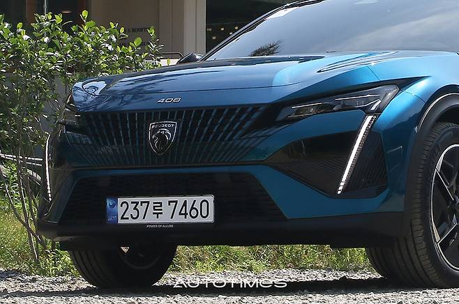 408의 외관은 푸조의 디자인 정체성과 크로스오버의 특성을 결합한 형태다. 전면부는 기하학적 패턴이 부채꼴 모양으로 활짝 퍼지는 듯한 그릴과 매서운 눈매의 헤드램프, 사자의 송곳니를 떠올리는 LED 주간주행등으로 구성해 푸조의 일원임을 알린다. 그릴과의 경계를 허문 헤드램프는 상단에 얇은 구멍을 뚫어 엔진룸 냉각 효과를 노렸다. 동시에 깊은 굴곡을 펜더 위까지 늘려 램프가 더 크고 날카로워 보인다. 주간주행등과 면의 방향에 따라 빗금 친 범퍼 커버는 최대한 뒤쪽까지 펼쳐 앞 오버행이 짧아 보이도록 했다.