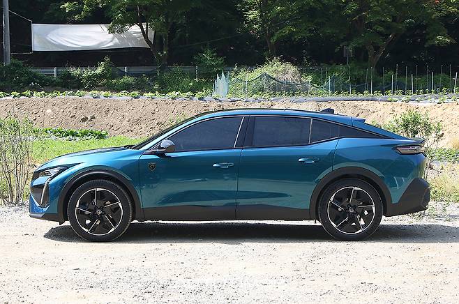 측면은 날렵하면서도 균형감 있는 쐐기형 실루엣이 매력적이다. 헤드램프에서 이어지는 듯한 캐릭터라인은 앞·뒤 펜더 아래로 흐르는 선들을 거쳐 트렁크 리드로 향한다. 측창은 C필러 커버를 활용해 뒤쪽까지 길어 보이도록 연출했다. 휠하우스를 포함한 차체 하부는 클래딩을 두르고 지상고를 높여 SUV의 느낌이 짙다. 그러나 전반적인 비례를 따져보면 세단, 해치백, SUV 등 딱 한 가지 차종을 꼽기 힘들 정도로 복합적이다.