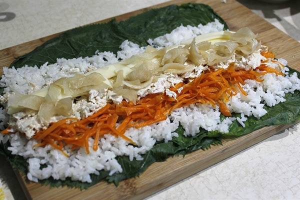 | ▲ 곰취를 겹치게 깔고, 김밥 싸듯이 재료를 얹는다. |