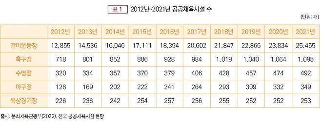문화체육관광부의 <전국 공공체육시설 현황>을 통해 지난 10년간 변화 추이를 살펴보면 야구장이 223개소(177.0%)로 가장 큰 폭으로 증가하였고 그다음으로 간이운동장 12,600개소(98.0%), 수영장 172개소(53.8%), 축구장 377개소(52.5%), 육상경기장 27개소(11.9%)가 증가하였다. 2012년부터 2021년까지 공공체육시설의 보급은 꾸준히 증가해 왔으나, 체육정책의 확산 노력에도 여전히 국민생활체육의 기반 시설의 확충이 필요한 실정이다. 2019년 4월, 관계부처 합동으로 발표한 <생활SOC 3개년 계획(안)>에 따르면 미국, 영국, 일본 등과 같은 선진국의 경우 수영장은 1~4만 명당 1개소를 공급하는 반면 우리나라의 경우 12.6만 명당 1개소를 보급하는 것으로 나타났다. 보급 현황은 8.8만 명으로 개선되었지만 선진국 수준에는 여전히 미치지 못하고 있다.