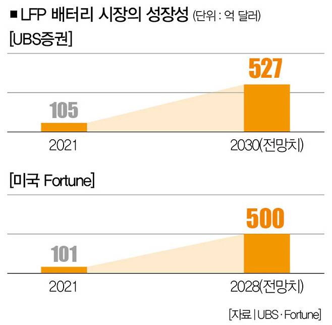 LFP 시장은 더 커질 전망입니다. 지난해 8월 UBS증권 보고서에 따르면 2021년 105억 달러(약 14조원)였던 전 세계 LFP 배터리 시장 규모는 연평균 19.7%씩 성장하고, 2030년엔 527억 달러(약 70조원)를 넘어설 것으로 보입니다. 그러면서 "2030년엔 LFP 배터리가 전 세계 배터리 시장의 40%를 차지할 것"이라는 전망도 내놨습니다. 국내 배터리 업계가 LFP 배터리 개발에 뛰어든 것도 이런 이유에서입니다.