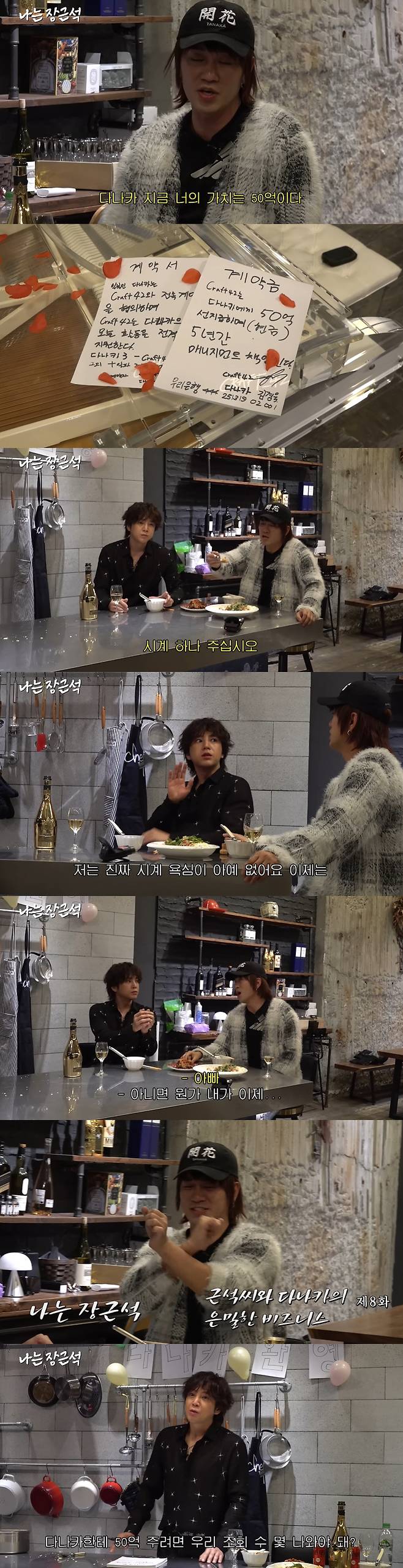 그때 다나카는 "계약하자"고 했고, 계약서를 쓰는 순간 갑과 을의 팽팽한 줄다리기가 시작됐다. 다나카나는 "계약서에 계약금이 안 들어가는 계약이 있냐"면서 "모두가 다나카 지금 너의 가치는 50억이라고 하더라"고 했다. 이에 장근석은 다나카 영입을 위해 큰 결심을 했고, "다나카한테 50억 주려면 우리 조회 수 몇 나와야 하냐"며 한 숨을 쉬어 웃음을 안겼다.