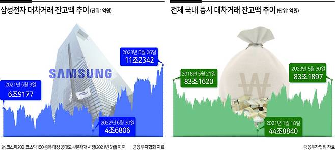 ▶공매도 대기자금, 전체 증시 83조·삼전 11조 돌파 ‘역대 최대’=1일 헤럴드경제가 금융투자협회 종합통계포털을 분석한 결과 지난달 26일 기준 삼성전자 한 종목에 대한 일간 대차거래 잔액 규모는 11조2507억원에 달했다. 이는 공매도가 부분 재개된 2021년 5월 이후는 물론, 관련 통계가 집계되기 시작한 2009년 이후 가장 큰 액수다.
