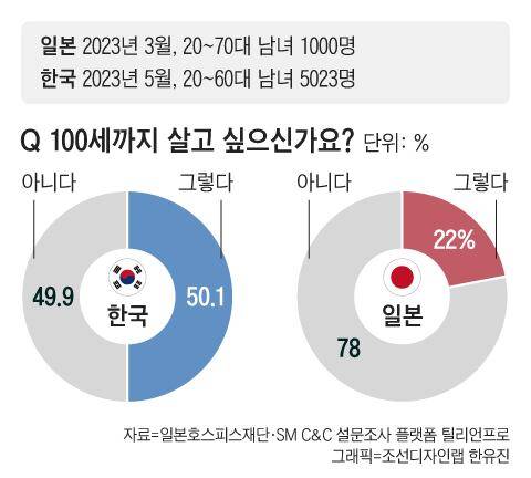 1일 본지가 SM C&C 설문조사 플랫폼인 ‘틸리언 프로’에 의뢰해 성인 남녀 5023명을 대상으로 조사한 결과에서도 이런 기대감이 뚜렷했다. 한국의 노인 빈곤율은 39%로 주요국 중 최악 수준이지만, 성인 두 명 중 한 명은 ‘100살까지 살고 싶다’고 희망하고 있었다. ‘100살까지 살고 싶다’는 응답 비율이 전체 응답자의 22%에 불과한 일본의 조사 결과와는 사뭇 결이 달랐다. 한일(韓日) 양국의 ‘100세 시대’ 인생관은 어떻게 다를까. 본지 설문 조사와 일본 호스피스재단이 성인 남녀 1000명을 대상으로 실시해 지난 3월 발표한 조사를 토대로 비교해 봤다.