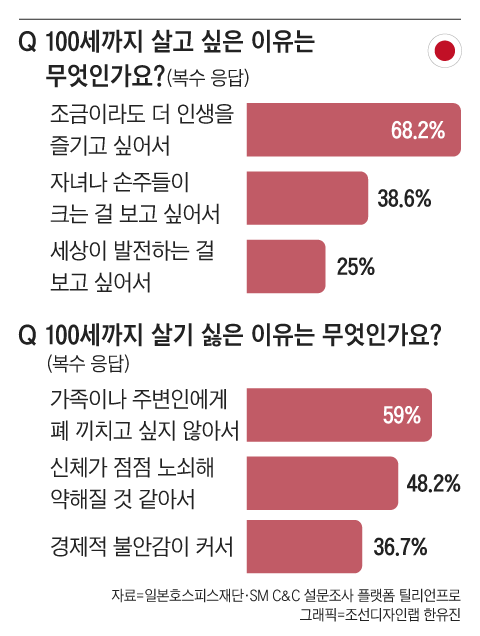 반면 일본은 응답자의 22%만 ‘100세까지 살고 싶다’고 대답했다. 나머지 78%는 ‘100세까지 살기 싫다’고 답했다. 주변에 폐를 끼치고 싶지 않아서(59%), 몸이 약해질까봐(48.2%), 경제적 불안감(36.7%) 등이 이유였다.