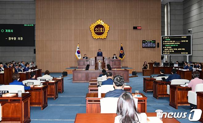 (광주=뉴스1) 박준배 기자 = 정무창 광주시의회 의장이 1일 시의회 본회의장에서 제317회 제1차 정례회 제1차 본회의 개회를 선언하고 있다.(광주시의회 제공) 2023.6.1/뉴스1