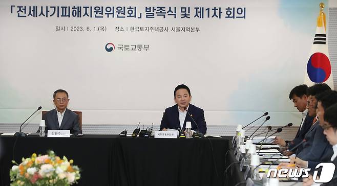 (서울=뉴스1) 구윤성 기자 = 원희룡 국토교통부 장관이 1일 오후 서울 강남구 한국토지주택공사 서울지역본부에서 열린 전세사기피해지원위원회 발족식 및 1차 회의에서 모두발언을 하고 있다.