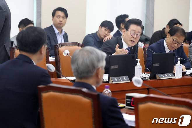 (서울=뉴스1) 황기선 기자 = 이재명 더불어민주당 대표가 1일 오후 서울 여의도 국회에서 열린 국방위원회 전체회의에서 신범철 국방부 차관에게 질의를 하고 있다. 2023.6.1/뉴스1