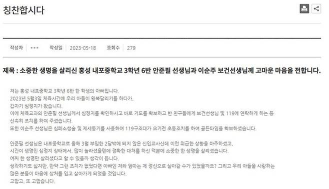 이들의 미담은 A 군 부모가 충남교육청 '칭찬합시다' 게시판에 글을 남기면서 더욱 알려지게 됐습니다.