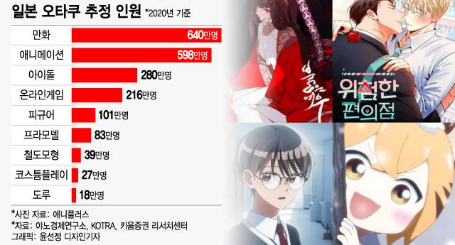 이날 야노경제연구소에 따르면 일본의 만화 오타쿠(한 분야에 열중하는 사람)는 640만명에 달할 것으로 추정된다. 온라인 게임 오타쿠 수(280만명)의 2배를 훌쩍 뛰어넘는다. 피규어(101만명)의 6배, 코스튬플레이(27만명)와 비교해서는 24배에 가까운 수치다.
