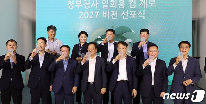 (세종=뉴스1) 김기남 기자 = 조소연 정부청사관리본부장(가운데)이 1일 오후 세종시 정부세종청사 중앙동에서 열린 정부청사 일회용 컵 제로 2007 비전 선포식에서 참석자들과 함께 다회용컵 시음 세리머니를 하고 있다. 2023.6.1/뉴스1