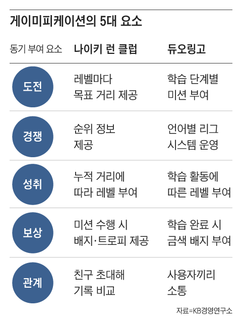 글로벌 스포츠용품 업체 나이키의 ‘나이키 런 클럽(NRC)’이라는 앱은 디지털 시계를 통해 거리·속도와 같은 러닝 데이터를 확인할 수 있는 앱이다. NRC의 더 큰 매력은 따로 있다. 사용자가 뛴 거리에 따라 레벨을 부여하고, 다른 사람들과 내 순위를 비교할 수 있게 해준다. 경쟁과 게임의 요소를 가미해 달리기의 묘미를 느끼게 도와준다는 얘기다.