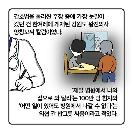 지난 1년 넘게 논란에 휩싸였던 간호법 제정안이 오늘 국회 본회의에 다시 상정된다. 윤석열 대통령이 이미 거부권을 행사한 만큼 사실상 폐기 수순을 밟을 것이다. 그동안 간호법을 둘러싼 주장 중에 가장 눈길이 갔던 건 한겨레에 게재된 강원도 왕진의사 양창모씨 칼럼이었다. 그가 전하는 왕진 현장의 안타까운 사연 속에 의료 사각지대에 놓인 이가 너무 많았다. 간호법 논의에서 정작 가장 중요한 환자 집단이 빠져 있다는 주장에 공감했다. 그는 “간호법 논쟁의 본질은 간호협회와 의사협회 두 이익집단의 싸움이 아니다. ‘제발 병원에서 나와 집으로 와 달라’는 집에서 나오기 힘든 100만 명 환자와 ‘어떤 일이 있어도 병원에서 나갈 수 없다’는 의협 간 밥그릇 싸움”이라고 적었다.