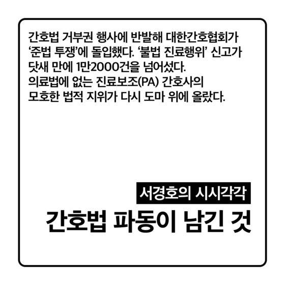 간호법 거부권 행사에 반발해 대한간호협회가 ‘준법 투쟁’에 돌입했다. ‘불법 진료행위’ 신고가 닷새 만에 1만2000건을 넘어섰다. 의료법에 없는 진료보조(PA) 간호사의 모호한 법적 지위가 다시 도마 위에 올랐다. 의료 현장에서 부족한 의사를 메워 주는 PA 간호사가 1만 명이 넘는다. ‘준법 투쟁’이라는 형용모순 자체가 현실을 따라가지 못하는 낡은 현행법을 적나라하게 드러냈다.