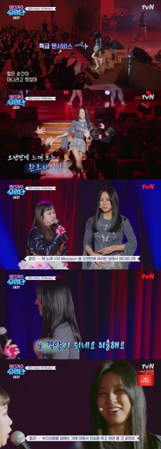 홍현희는 "('텐미닛' 무대) 몇 년 만에 하신 거냐"라며 질문했고, 이효리는 "한 15년, 20년. 예전에는 군대 같은 데 가면 호응이 너무 좋으셔서 더 날아다니면서 했던 기억이 난다. 오늘은 '오실까? 좋아해 주실까?' 걱정이 많이 됐다"라며 밝혔다.