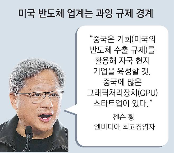 미 반도체 업계는 규제 일변도의 정책이 능사는 아니라는 입장이다. 홍콩 사우스차이나모닝포스트(SCMP) 등에 따르면 젠슨 황 엔비디아 최고경영자(CEO)는 지난달 31일 “(우리는) 규제가 어떻든 준수하겠지만 중국은 그 기회를 놓치지 않고 자국 기업을 육성할 것”이라며 “중국에 그렇게 많은 그래픽처리장치(GPU) 스타트업이 있는 이유”라고 지적했다. 덱스터 로버츠 애틀랜틱카운슬 선임연구원 또한 “미국반도체협회(SIA)는 수출 규제로 미국 및 동맹국 기업이 큰 피해를 입지 않아야 한다고 보고 있다”고 가세했다.