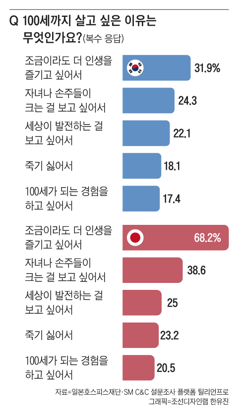 반면 일본은 응답자의 22%만 ‘100세까지 살고 싶다’고 대답했다. 나머지 78%는 ‘100세까지 살기 싫다’고 답했다. 주변에 폐를 끼치고 싶지 않아서(59%), 몸이 약해질까 봐(48.2%), 경제적 불안감(36.7%) 등이 이유였다.