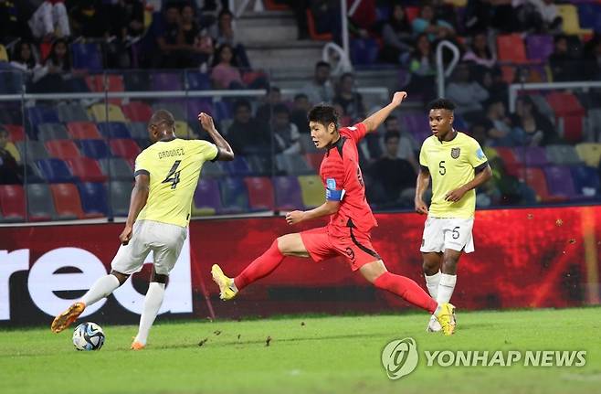 (산티아고 델 에스테로=연합뉴스) 임화영 기자 = 1일(현지시간) 오후 아르헨티나 산티아고 델 에스테로 스타디움에서 열린 2023 국제축구연맹(FIFA) 20세 이하(U-20) 월드컵 16강전 한국과 에콰도르의 후반전 경기에서 이영준이 상대 골문을 압박하고 있다. 2023.6.2