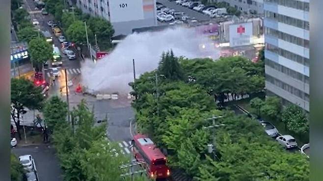 도로 한복판에서 갑작기 뿜어져 나온 물줄기가 일대를 뒤덮습니다.