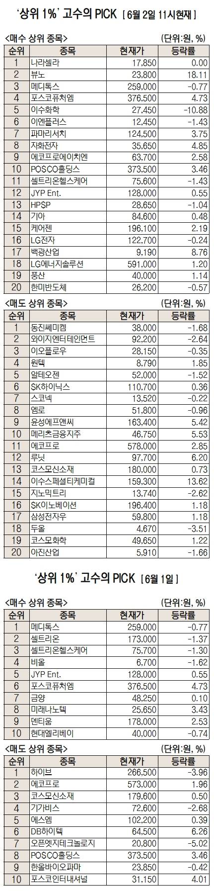 미래에셋증권에서 거래하는 고수익 투자자들이 2일 오전 가장 많이 순매수한 종목은 나라셀라(405920)로 나타났다. 뷰노(338220), 메디톡스(086900), 포스코퓨처엠(003670) 등도 상위권에 이름을 올렸다.