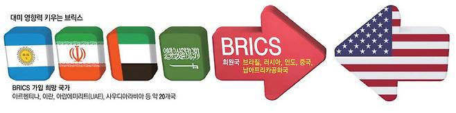 신흥 경제 5개국을 지칭하는 브릭스(BRICS·브라질, 러시아, 인도, 중국, 남아프리카공화국)가 글로벌 무대에서 존재감을 키우며 '탈(脫)미국화'에 속도를 내고 있다. 브릭스에 속해 있는 러시아를 향한 서방의 고강도 제재로 인한 '경제 피해 유탄'이 다른 브릭스 국가에도 떨어지고 있는 만큼 미국 의존도를 낮추기 위해 본격적인 지역·경제 통합에 나서야 한다는 목소리가 커지고 있다.