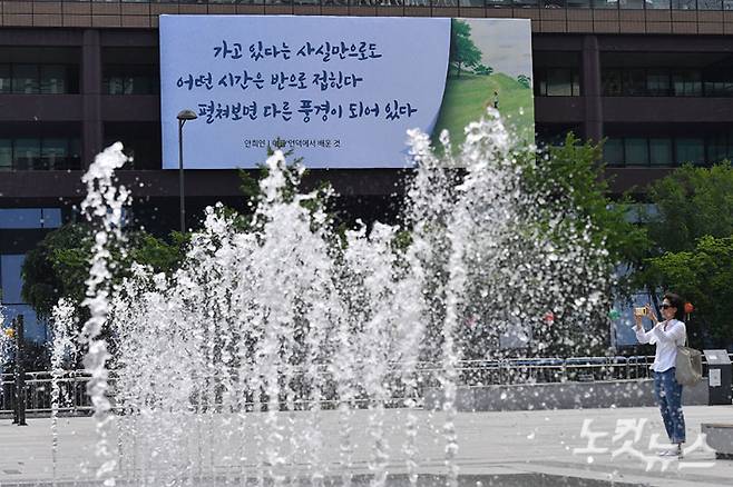 30일 오전 서울 종로구 교보생명 빌딩 외벽에 안희연 시인의 '여름 언덕에서 배운 것' 글귀로 꾸며진 광화문글판 여름편이 걸려 있다. 류영주 기자