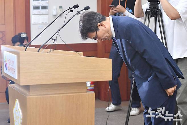 노태악 중앙선거관리위원장이 31일 오후 과천 중앙선거관리위원회에서 고위직 간부들의 자녀 특혜 채용 의혹에 대한 특별감사 결과와 후속대책을 발표하기에 앞서 사과 인사를 하고 있다. 노 위원장은 "누구보다도 공정해야 할 선관위가 최근 미흡한 정보보안 관리와 고위직 간부들의 자녀 특혜 채용, 부정승진 문제 등으로 큰 실망을 드렸다"고 사과했다. 류영주 기자