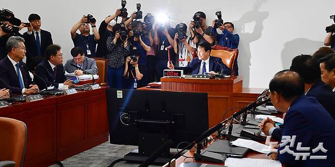 30일 서울 여의도 국회에서 열린 윤리특별위원회 거액의 가상자산 보유·거래 논란에 더불어민주당을 탈당한 무소속 김남국 의원에 대한 징계안 논의를 위한 전체회의에서 변재일 위원장이 의사봉을 두드리고 있다. 윤창원 기자