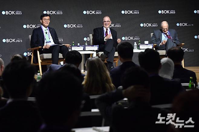 이창용 한국은행 총재가 1일 오전 서울 중구 한국은행 별관에서 '팬데믹 이후의 정책과제(Policy Challenges After the Pandemic)'라는 주제로 열린 2023년 BOK 국제컨퍼런스에 참석해 정책 대담을 하고 있다. 왼쪽부터 이창용 한국은행 총재, 나라야나 코처라코타 교수, 토마스 사전트 교수. 한국은행 경제연구원에서는 2005년부터 국내외 저명한 석학들과 각국 중앙은행 정책담장자들을 초청해 컨퍼런스를 개최했다. 류영주 기자