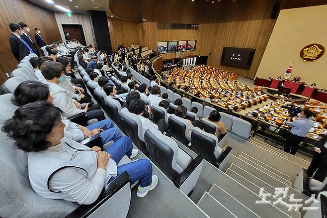 대한간호사협회 회원들이 30일 서울 여의도 국회에서 열린 제406회국회(임시회) 제2차 본회의에서 간호법이 재표결에 앞서 여야 의원들의 반대토론을 지켜보고 있다. 이날 본회의에서는 윤석열 대통령이 재의요구권(거부권)을 행사한 간호법 제정안이 출석 의원 289명 중 찬성 178명, 반대 107명, 무효 4명으로 최종 부결됐다. 윤창원 기자
