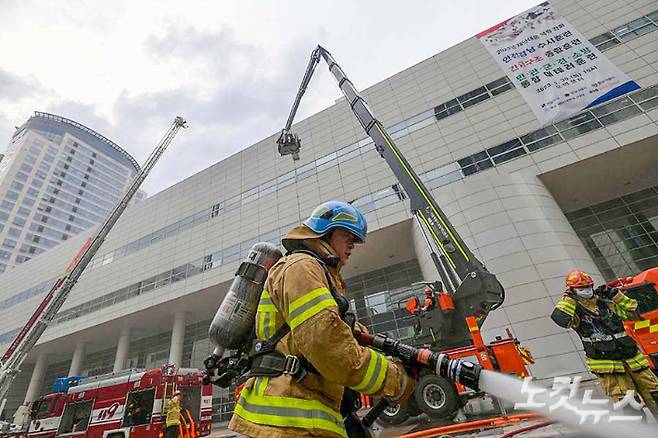 30일 서울 강남구 무역센터 소방도로에서 생화학테러 및 대형화재 발생을 가정한 재난대비 훈련이 진행되고 있다. 이번 훈련은 다중밀집시설에서 발생한 재난 상황에 대비해 각 기관의 대응 매뉴얼과 협력 시스템을 점검하기 위해 기획됐다. 강남구, 강남소방서, 강남경찰서, 6019부대, ㈜WTC Seoul 등 총 14개 기관과 2개 민간단체에서 약 500명이 훈련에 참여했다. 박종민 기자