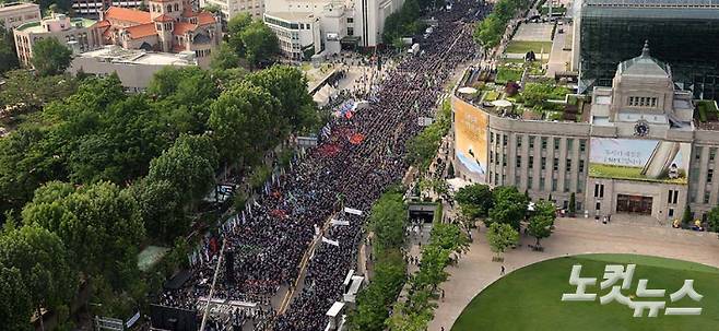 31일 서울 태평로 일대에서 전국민주노동조합총연맹 경고파업 결의대회가 열리고 있다. 민주노총은 윤석열 정부가 노조와 전혀 소통하지 않는 '불통 정권'이라며 비판의 목소리를 높였다. 이날 집회는 오후 8시22분쯤 경찰의 해산 요청에 민주노총이 자진 해산하면서 마무리됐다. 박종민 기자