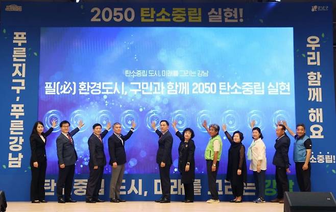 구청장과 구민 10여명이 참가해 대형 LED 화면에 손바닥을 대면 실천 선언문의 핵심 키워드와 지구 이미지가 등장하는 ‘탄소중립 도시, 미래를 그리는 강남’ 퍼포먼스가 이어졌다.
