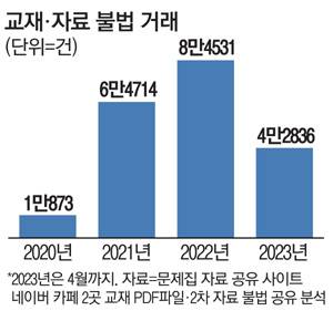 2일 매일경제신문과 익명을 요구한 에듀테크 업체 A사 분석에 따르면 수능·내신 교재와 문제집 등 거래가 활발한 대표적인 네이버 카페 2곳을 조사해봤더니 불법거래건수는 올해에만 4월 기준 4만2836건으로 집계됐다. 거래 건수는 2020년 1만873건, 2021년 6만4714건, 2022년 8만4531건 등으로 매년 증가하고 있었다. 업체 측은 2020~2023년 4월까지 누적 거래 건수는 21만건으로 한건당 교재 단가를 1만5000원으로 잡고 계산할 경우 교재 매출로만 약 31억원 손실이 발생했다는 추산이 나온다고 밝혔다.
