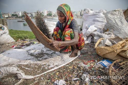 epaselect epa10668610 A woman sorts plastic chips near the Buriganga river in Dhaka, Bangladesh, 22 May 2023. (Issued 02 June 2023). The World will mark the 2023 Environment Day on 05 June with a focus on "solutions to plastic pollution" EPA/MONIRUL ALAM ATTENTION: This Image is part of a PHOTO SET