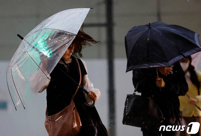 (도쿄 로이터=뉴스1) 우동명 기자 = 2일 (현지시간) 괌을 강타하고 북상하는 태풍 '마와르'의 영향으로 폭우가 내린 일본 도쿄에서 행인이 힘겹게 우산을 들고 걸어 가고 있다. 2023.6.2 ⓒ 로이터=뉴스1