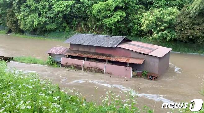 (기즈가와 로이터=뉴스1) 우동명 기자 = 2일 (현지시간) 괌을 강타하고 북상하는 태풍 '마와르'의 영향으로 폭우가 내린 일본 교토부 기즈가와에서 범람하는 강물에 잠긴 주택이 보인다. 2023.6.2