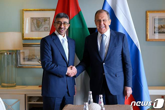 (케이프 타운 로이터=뉴스1) 우동명 기자 = 세르게이 라브로프 러시아 외무장관이 2일(현지시간) 남아프리카공화국 케이프 타운에서 열린 브릭스 외무장관 회의 중 압둘라 빈 자이드 알 나흐얀 UAE 외교장관과 악수를 하고 있다. 2023.6.2