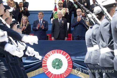 epa10668918 A handout picture made available by the Quirinal Presidential Palace (Palazzo del Quirinale) Press Office shows Italian President Sergio Mattarella (C) attending the annual military parade on the occasion of the 77th anniversary of the Republic Day (Festa della Repubblica) in Rome, Italy, 02 June 2023. The anniversary marks the founding of the Italian Republic in 1946. EPA/QUIRINAL PALACE PRESS OFFICE HANDOUT ++ HANDOUT PHOTO TO BE USED SOLELY TO ILLUSTRATE NEWS REPORTING OR COMMENTARY ON THE FACTS OR EVENTS DEPICTED IN THIS IMAGE +++ HANDOUT EDITORIAL USE ONLY/NO SALES/NO ARCHIVES