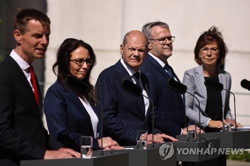 epa10668931 German Chancellor Olaf Scholz (3-L) looks on next to President of German Nature Conservation Ring (Deutscher Naturschutzring, DNR) Kai Niebert (L), German trade union confederation Deutscher Gewerkschaftsbund (DGB) Chairwoman Yasmin Fahimi (2-L), President of the German Confederation of Skilled Crafts (ZDH) Joerg Dittrich (4-L) and German business organisation for the energy and water industry (Bundesverband der Energie- und Wasserwirtschaft, BDEW) Marie-Luise Wolff (R), during a press conference following a meeting of the Alliance for Transformation in Berlin, Germany, 02 June 2023. In the 'Alliance for Transformation' dialog format, the German government consults with business, social partners and academia on key transformation fields and their interactions. EPA/CLEMENS BILAN