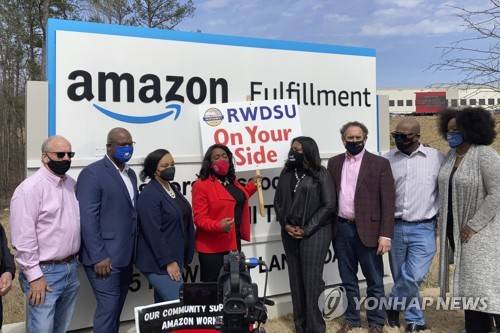 FILE - Democratic members of Congress join representatives of the Retail, Wholesale and Department Store Union gather outside an Amazon fulfillment center in Bessemer, Ala., on March 5, 2021, to advocate for the ongoing unionization vote at the sprawling campus. An Amazon worker in Alabama that has been vocal in unionization efforts, has been terminated by the company, according to the Retail, Wholesale and Department Store Union, Friday, June 2, 2023.. (AP Photo/Bill Barrow) FILE